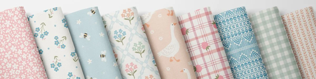 Goose Cottage captures the gentle charm of the countryside. White geese wander with dainty florals and strawberry picnic checks. This sweet collection is especially suited to children’s clothing, baby quilts, nursery textiles, and heirloom sewing projects that call for storybook softness. Please get in touch to request custom colours and sizes.